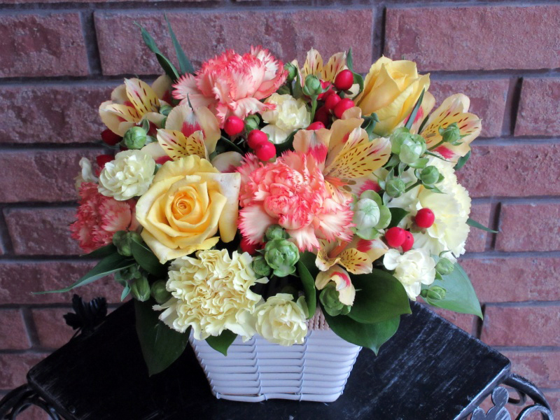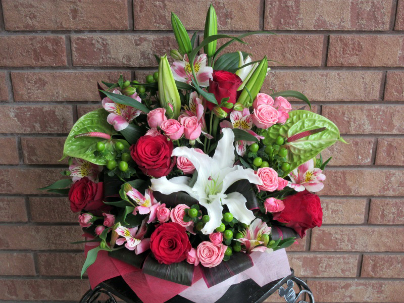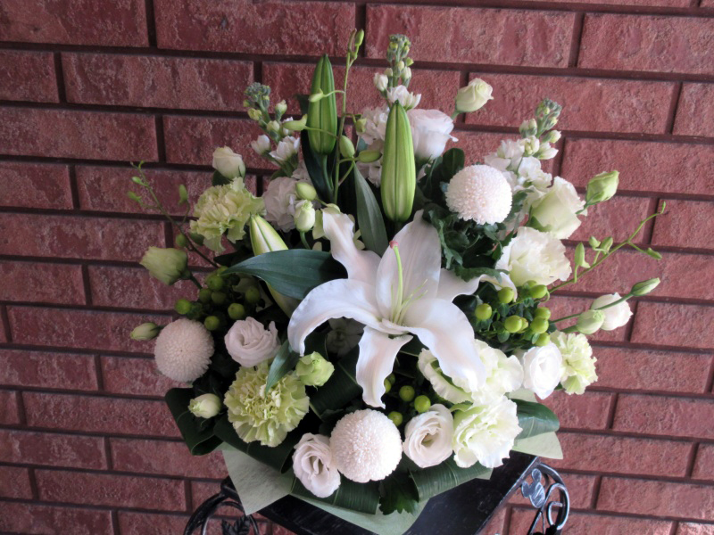当店では花束・アレンジメント・スタンド花等の注文を承っております。もちろん、御供え用の花束やアレンジメントもご希望の色合いやご予算等でお作りさせていただきますので、お気軽にお問い合わせください。