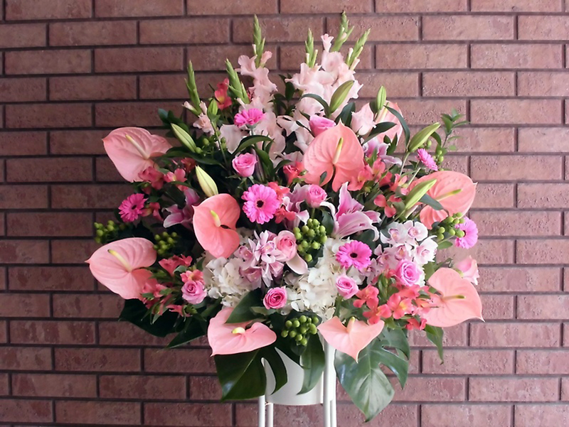 白いスタンド台に活けた可愛らしい色合いのお祝いスタンド花です☆ピンクの色合いでお作りしますのでお店のオープンや発表会や楽屋花に目立つこと間違いなし!