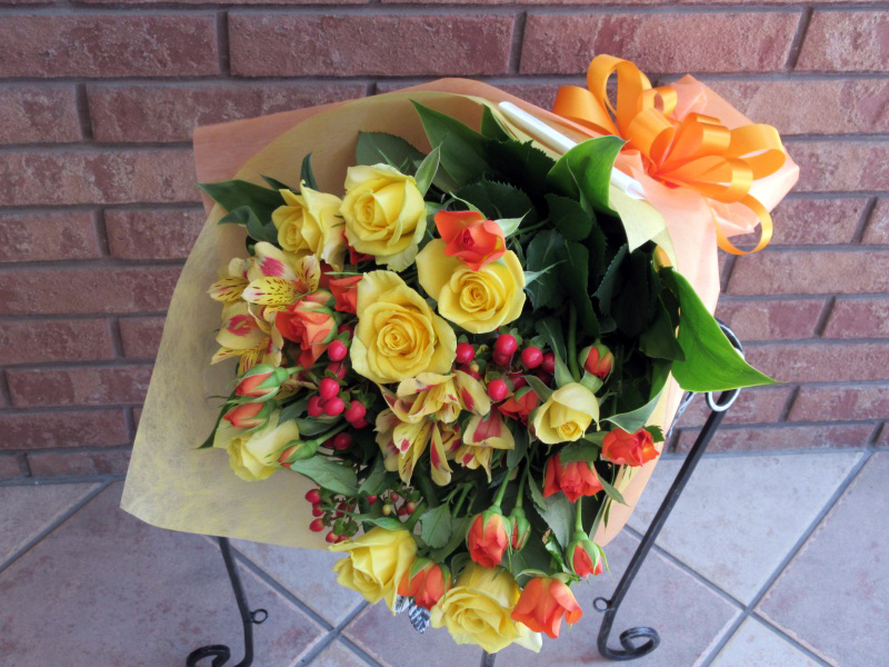 バラをたっぷり使ってイエロー・オレンジ系にまとめて可愛く仕上げた花束です♪女性にはもちろん男性への贈り物にもピッタリですよ☆お誕生日プレゼントやお祝い、お見舞い、歓送迎にもオススメですよ!
