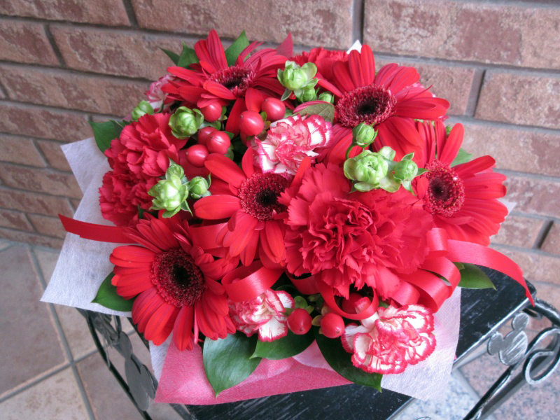 真っ赤な花を集めたアレンジメントです☆お誕生日の贈り物やお祝い事の贈り物にピッタリ♪還暦の贈り物にも喜ばれそうですね!!