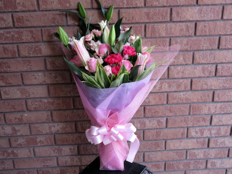 ピンクのユリがとっても上品!!色合いを合わせたピンクのバラも入れてエレガントな雰囲気に仕上げています☆同系色の花束はどんな方にも喜んでいただけますよ!お誕生日や記念日、お祝い事にもぜひどうぞ!!