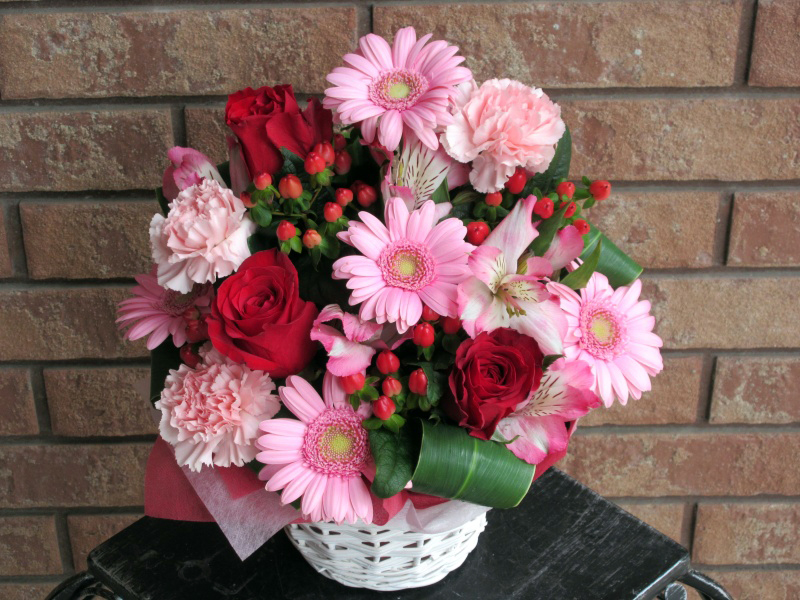 女性に大人気のピンク・赤系アレンジ☆ガーベラとバラで華やかに仕上げています!お誕生日やお祝いの贈り物にもお使いいただけますよ♪