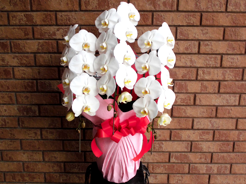 豪華な白の胡蝶蘭鉢・3本立です。定番の白色ですがボリュームがあって華やかですよ!お店の開店や事務所の開業、病院の開院のお祝いは、やはり白の胡蝶蘭が人気です。ぜひどうぞ。